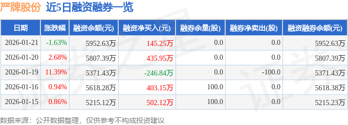 证券之星音讯,到2026年1月21日收盘,严牌股份(301081)报收于12.05元,跌落1.63%,换手率4.24%,成交量9.24万手,成交额1.11亿元。